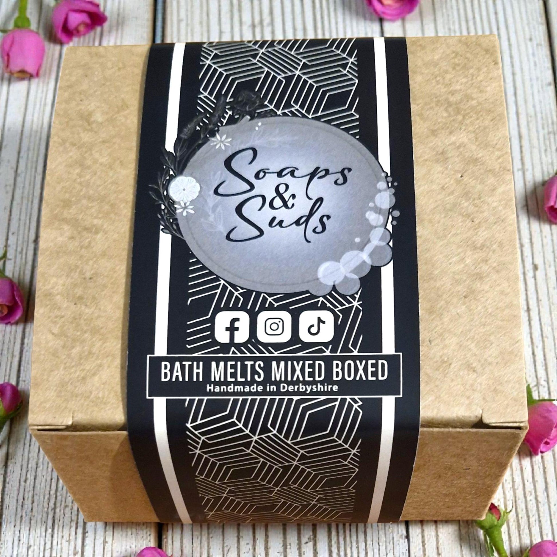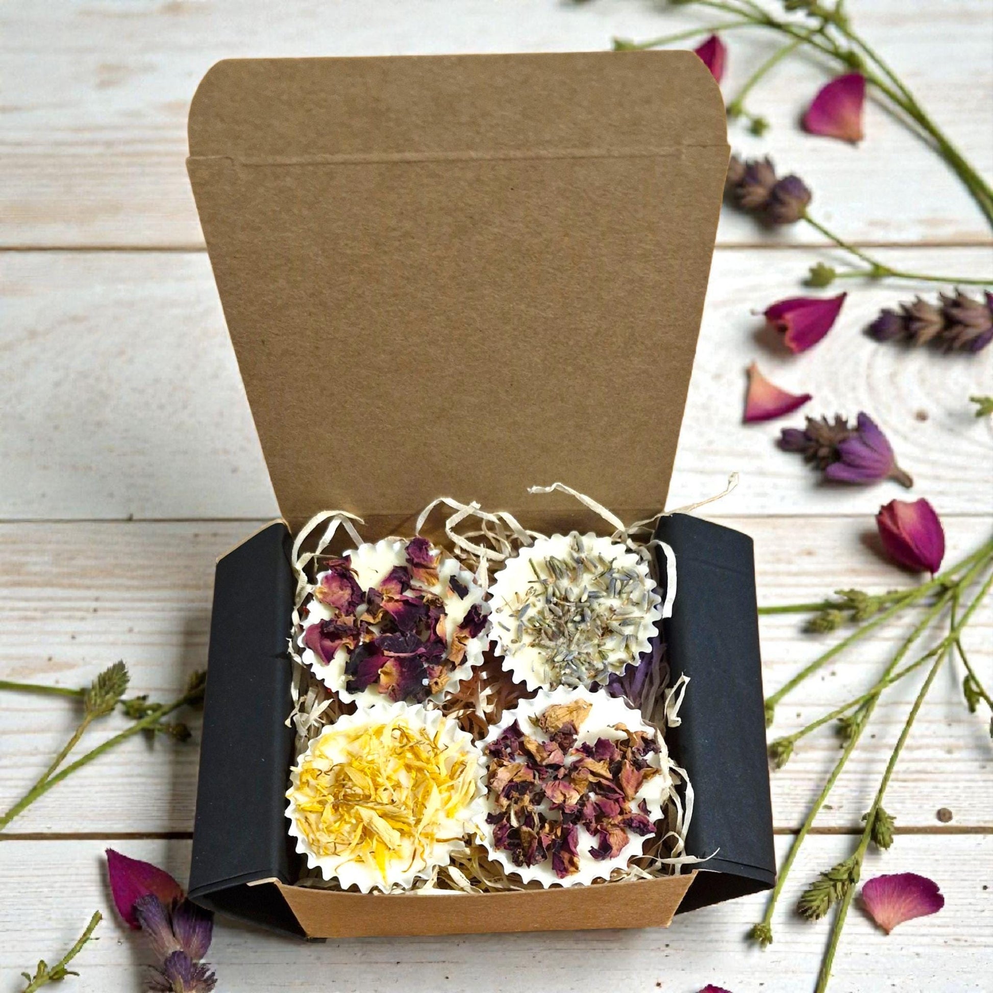 Our handmade bath melt set includes 4 bath melts (13-15g each) made from 100% Cocoa butter, beautifully presented in a recycled kraft box lined with tissue paper and wood wool for that perfect gift.